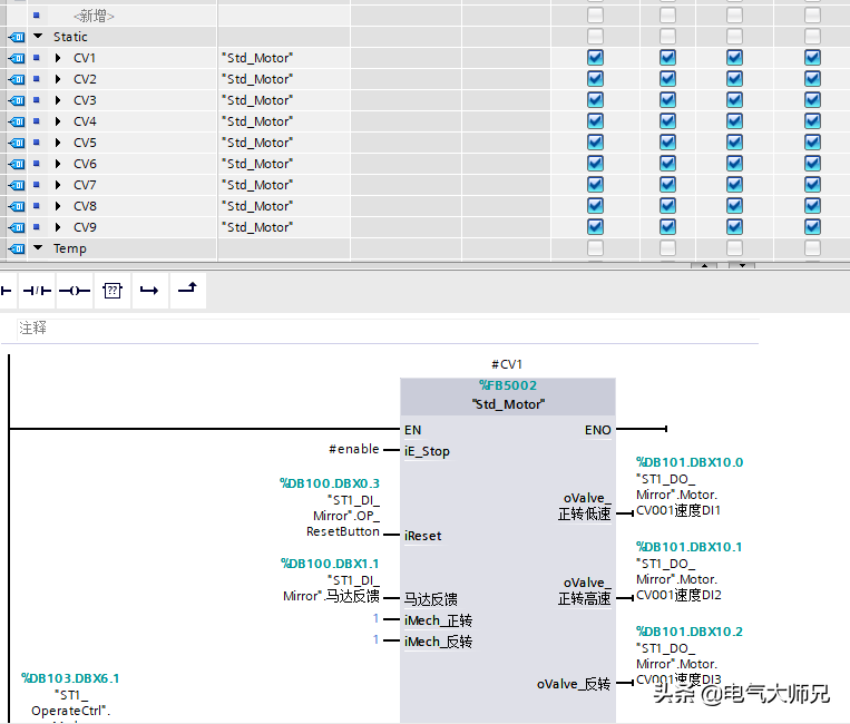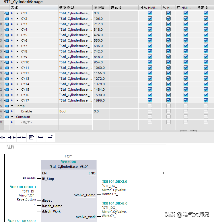 二.FC函数和FB函数块的区别在哪里呢,首先FB块有自己的背景数据块,就是专有的存储区,我们什么时候选择建立FB块呢,根据我自己以往的经验来说,就是需要重复使用的标准功能,例如一个项目里面有50个气缸需要控制30个电机需要控制,在这种情况下,我们就可以选择做两个电机和气缸的标准FB块,其余的都可以用FC。