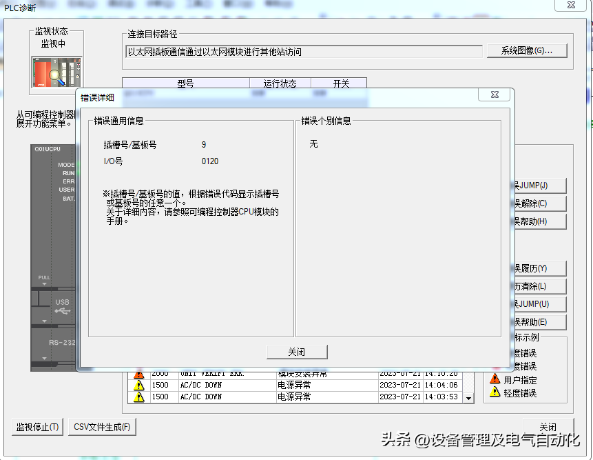 双击对应的错误详情栏“模块安装异常”后出来更详细的信息,从图上看出出现异常的模块在9号插槽,他的起始地址是120。