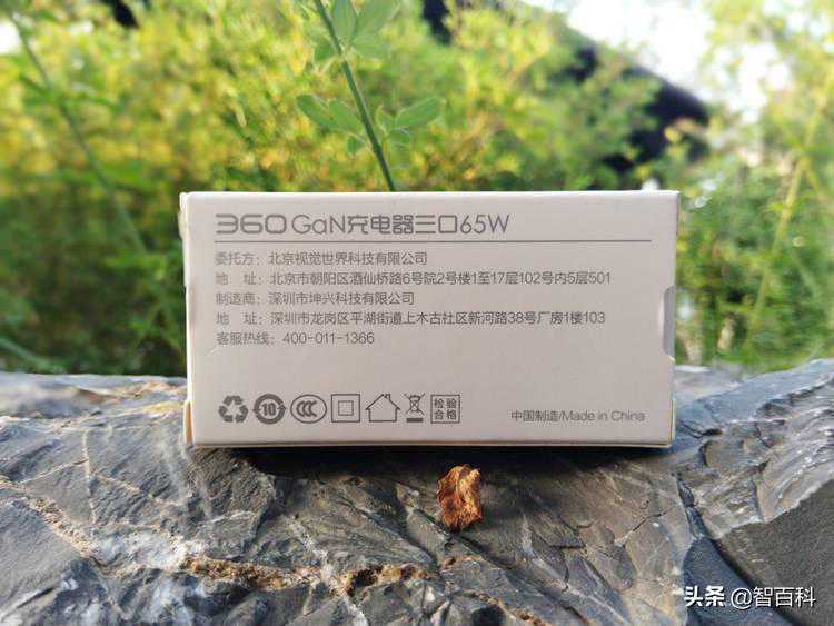 包装盒背面仍然是银灰色字体印有GaN充电器三口65W、委托方及其地址、制造商及其地址、客服热线,还有一些图标标志及中国制造/MadeinChina等字样。