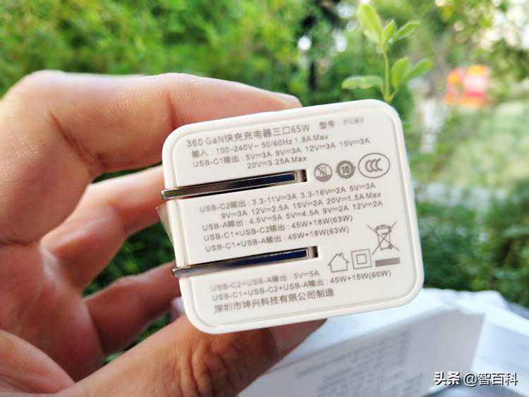 从图中我们可以看出360GaN氮化镓快充充电器是三输出口,USB-C1为TYPE-C接口,支持5V/3A、9V/3A、12V/3A、15V/3A、20V/3.25A电压输出,最大输出功率为65W;USB-C2也是TYPE-C接口,支持3.3-11V/3A、3.3-16V/2A、5V/3A、9V/3A、12V/2.5A、15V/2A、20V/1.5A,最大输出功率为30W;USB-A为USB接口,支持4.5V/5A、5V/4.5A、9V/2A、12V/2A,最大输出功率为24W。从3输出口参数来看USB-C1功率最大,适合给5-20V设备充电,当然更适合给支持快充的大功率笔记本电脑充电,USB-C2适合给3.3-20V设备充电,但受其输出电流和功率限制,适合给不超过30W的设备如平板、手机等设备充电;USB-A适合给4.5-12V设备充电,适合不超过24W的设备如平板、手机等设备充电。