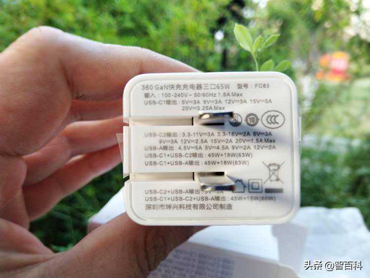 我们再来看看插脚面,这里也印刷了充电器详细信息和参数,产品名称、产品型号、输入输出参数(和前面包装盒印刷的一致)、制造公司、及各类认证标志和环保标志。