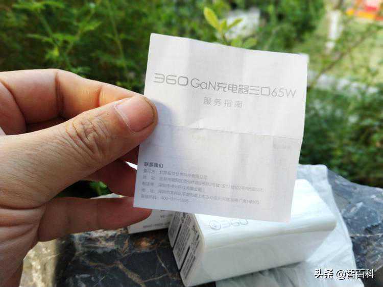 包装袋子里还有一张小纸片,是服务指南,印有360GaN充电器三口65W、委托方及地址、制造商及地址、客服热线等联系方式,背面印刷的是保修卡内容。
