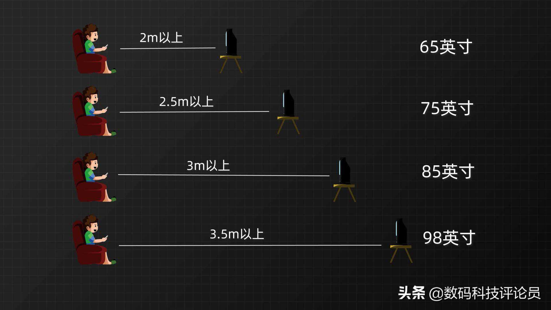 当然,在同样的参数规格下,越大肯定越贵,我的建议是,只要你预算足够充足,并且家里客厅够大,那么能买大尺寸就尽量选择大的。因为大尺寸电视视觉冲击感一定更强,这里有一个我个人总结的参考标准,观看距离在2米以上选择65英寸,2.5米选75英寸,3米就85英寸,3.5米以上就选98英寸。