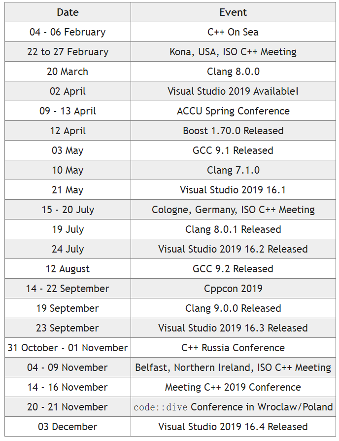 下表按日期顺序列出了本年度C++发生的重大事件: