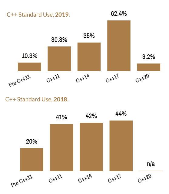 我们可以看到,今年C++17标准的采用率在稳步增长。