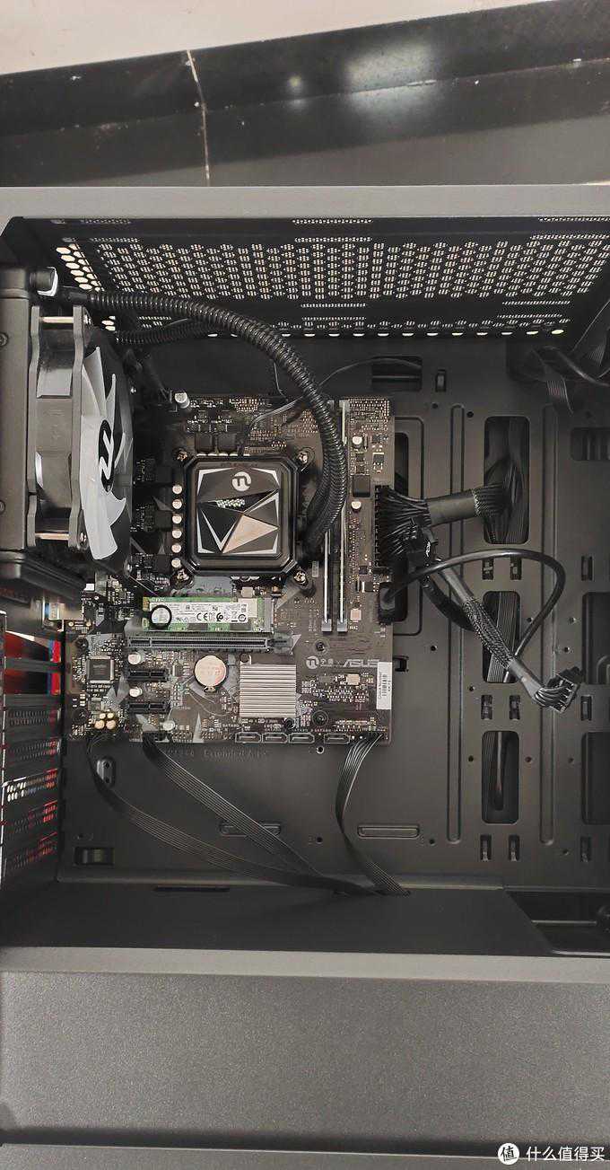 没有什么亮点的华硕小板和固态+I510600KF,F是无核显的,K可以超频。装机人员真的是……这走线,也不理一理,没眼看。毫无亮点的120水冷,压个I5倒也算没问题。