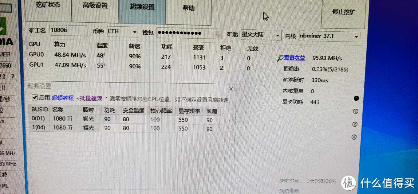 魔龙拉满后,算力也是48M左右,温度不到60°,功耗220多W。1080ti系里的高端卡大多数都保持在满载47M左右的算力,显存颗粒也都是清一色的镁光,个别是三星,海力士那种垃圾不配出现。凡是海力士显存的卡,玩游戏还行,挖矿千万别买。