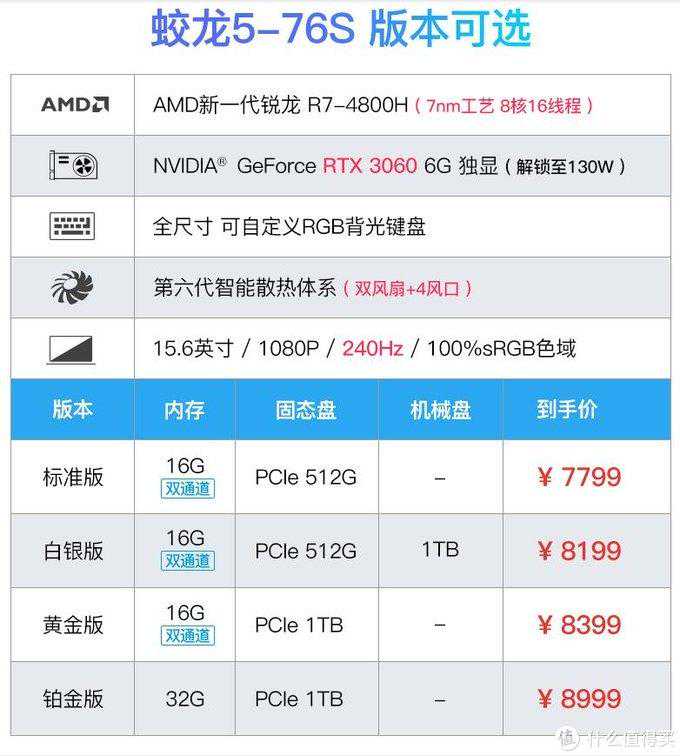 蛟龙5-76S(R7-4800H/RTX3060/100%sRGB/240Hz电竞屏/15.6英寸),领券+金币立减最后优惠可以做到7421到手。