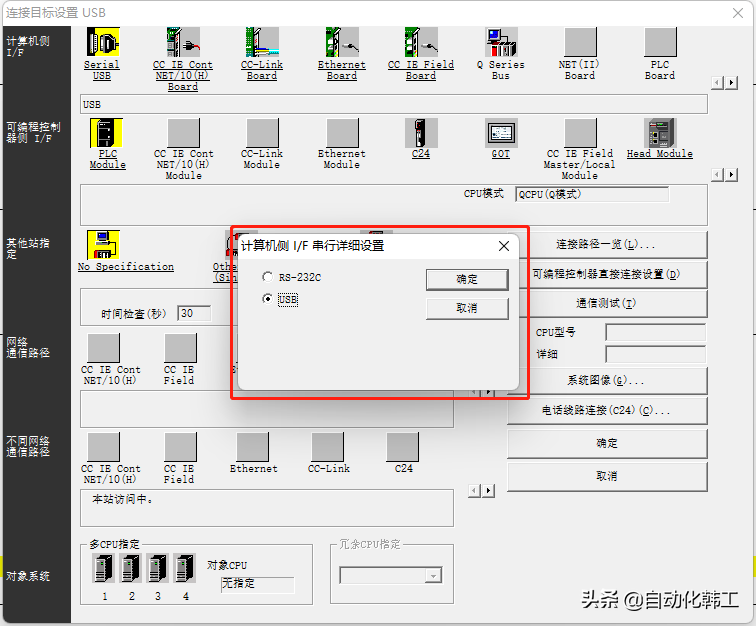 三菱Q系列PLC,一般有USB连接,自带以太网端口连接,以太网模块连接三种模式,今天就讲一下三种模式的连接流程