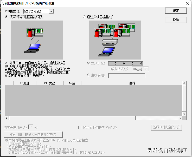 另一种是通过集线器,也就是交换机进行连接,这里需要设置IP地址,要和CPU内置以太网口的IP一致,这里可以通过搜索网络上的以太网内置型PLC进行查找,会显示出IP地址