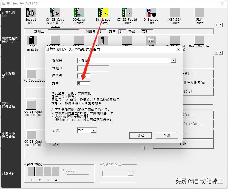 可编程控制器侧,选择EthernetModule,设置站号、IP地址,这里的站号要与以太网模块的站号一致。