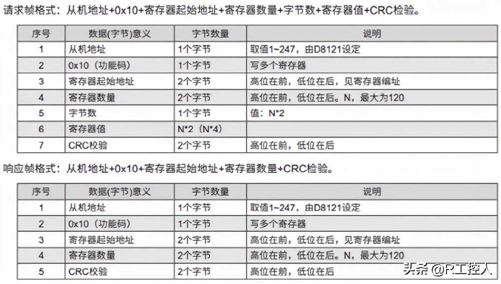 使用0x10功能码写入多个保持型寄存器数据,发送数据及返回数据格式如下: