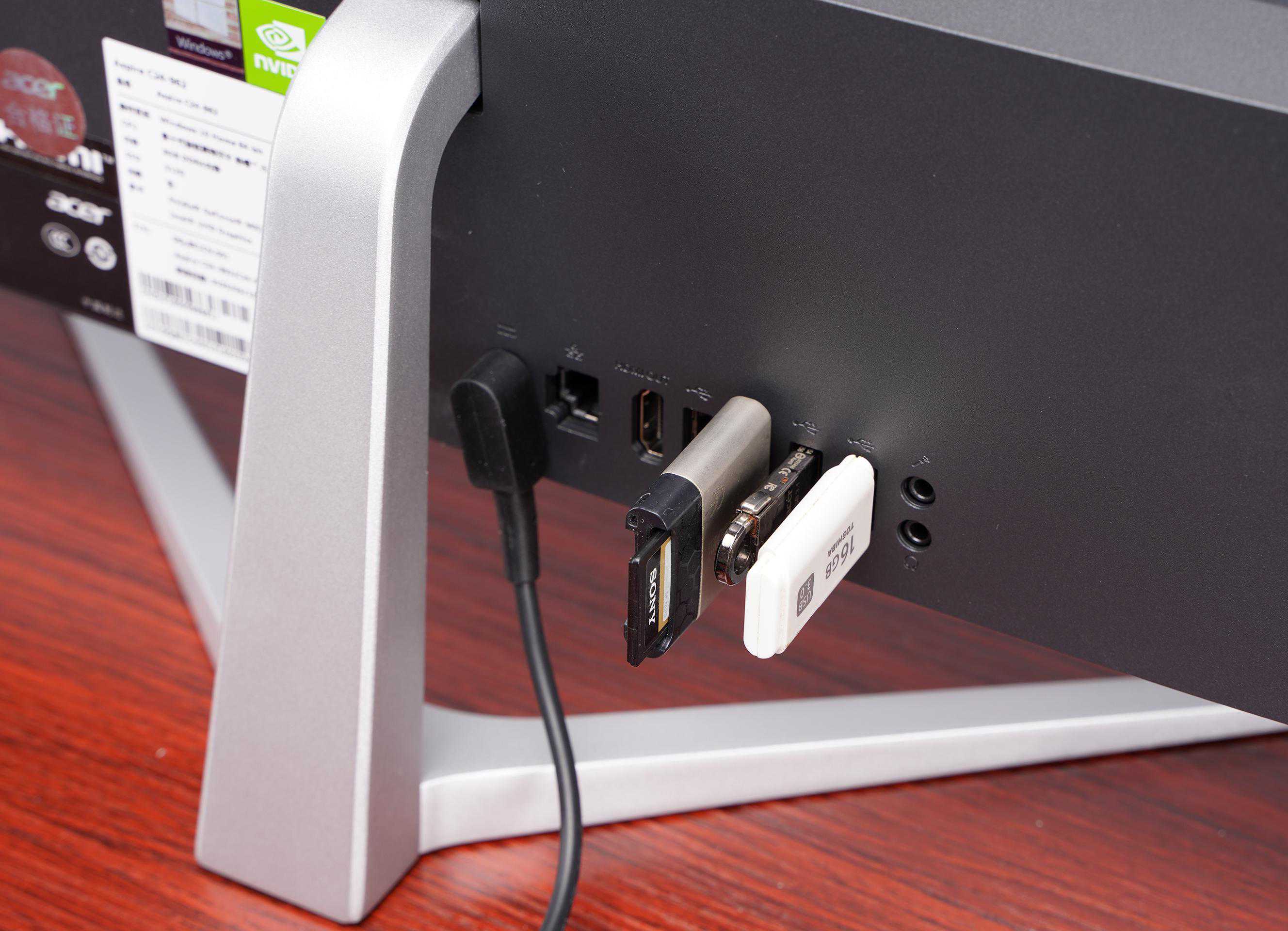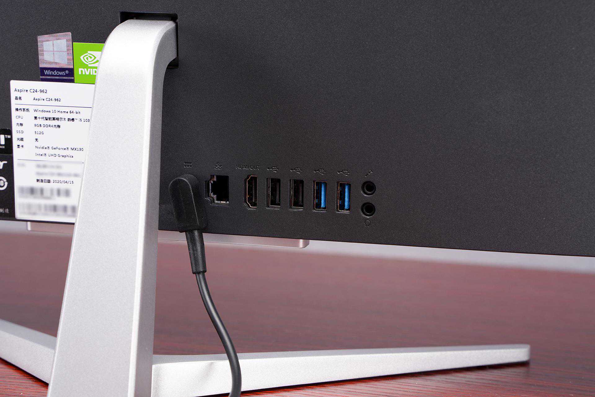 相信玩DIY的小伙就猜出是一体机了,因为机身背面下方设有RJ45网口、HDMI输出接口、*2、接口*2,音频接口。当然了,除了RJ45有线网络,它还内置802.11ac无线网卡。由于无线键鼠接收器已经占用一个USB接口,因此可用也只有3个USB接口,对于办公来说也基本够用。而HDMI输出接口方面用户扩展屏幕进行使用,毕竟现在双屏办公也属于常见的使用场景。