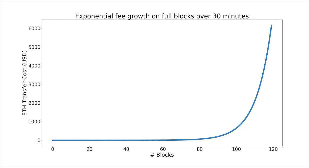 这是一个重要的认识。如果区块超过1000万gas已有一段时间,则交易会变得非常昂贵,最终将需求推低。交易成本上升的速度有多快?