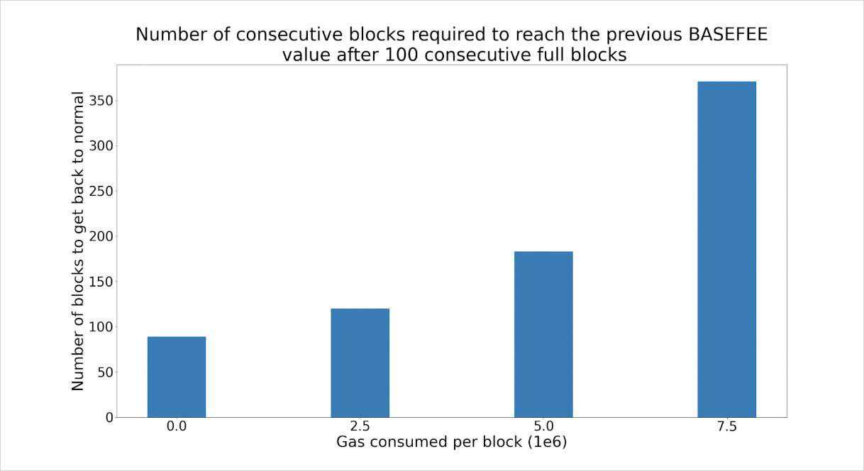 想象一下,已经有持续100个2000万gas的区块。为了与前面的例子保持一致,平均交易成本已增加到657美元以上。为了让BASEFEE回到起点,必须开采89个空区块。此外,我们还可以开采183个500万gas的区块,371个750万gas的区块,等等。
