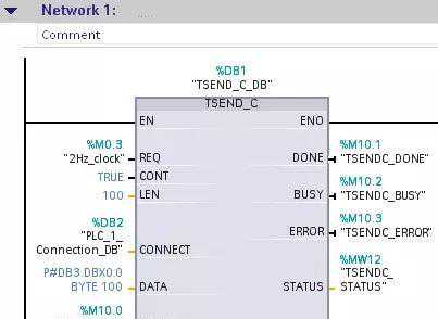 在主程序中调用发送通信指令,进入“Projecttree”“PLC_1”“Programblocks”“Main”主程序中,从右侧窗口“Instructions”“ExtedInstructions”“Communications”下调用“TSEND_C”指令,并选择“SingleInstance”生成背景DB块。然后单击指令块下方的“下箭头”,使指令展开显示所有接口参数。