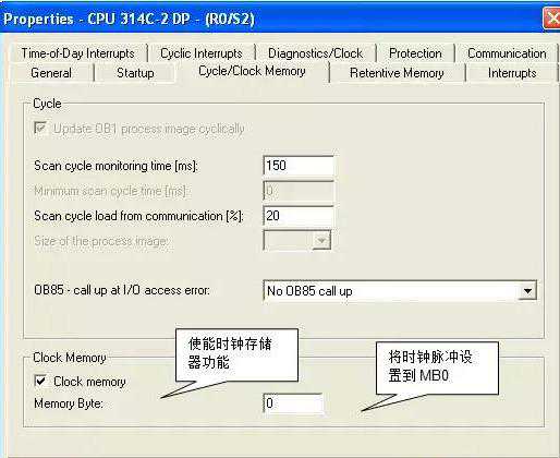 为了编程方便,我们使用时钟脉冲激活通信任务,在CPU的“Properties”>“Cycle/ClockMemory”中设置,如图5所示。