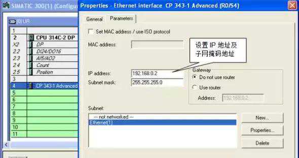 进入“HWConfig”中,组态所使用的CPU及“CP343-1”模板。并新建以态网Ethernet(1),配置“CP343-1”模板IP地址为:192.168.0.2,子网掩码为:255.255.255.0。如图6所示。配置完硬件组态及属性,编译存盘并下载所有硬件组态。