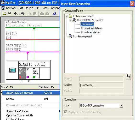 S7-1200CPU与S7-300/400之间通过ISOonTCP通信,需要在双方都建立连接,连接对象选择“Unspecified”。