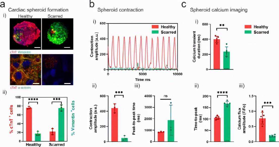 为了对健康的心肌建模,作者对直接接触的8个健康球体的环进行了生物打印,而对有疤痕的心肌模型进行了7个健康球体和1个瘢痕性球体的环的生物打印(图5ai)。培养5天后,cTnT和波形蛋白的双重染色证实了相邻球体之间的融合,并且在疤痕微组织中观察到了高成纤维细胞密度的区域(图5aii)。在微组织的健康区域也观察到了健壮的肌节染色,在疤痕区域观察到了较低的水平(图5aiii)。另外,连接蛋白-43在细胞边界处的染色表明在微组织的健康区域中间隙连接的形成,而在疤痕区域中发现的染色水平较低(图5aiv)。从支持水凝胶中取出后,微组织环也以连续且同步的方式收缩(图5bi)。对微组织收缩的定量分析显示,与健康对照组相比,疤痕微组织的收缩幅度有降低的趋势(图5bii–iii),模仿了MI后全球收缩力的下降。