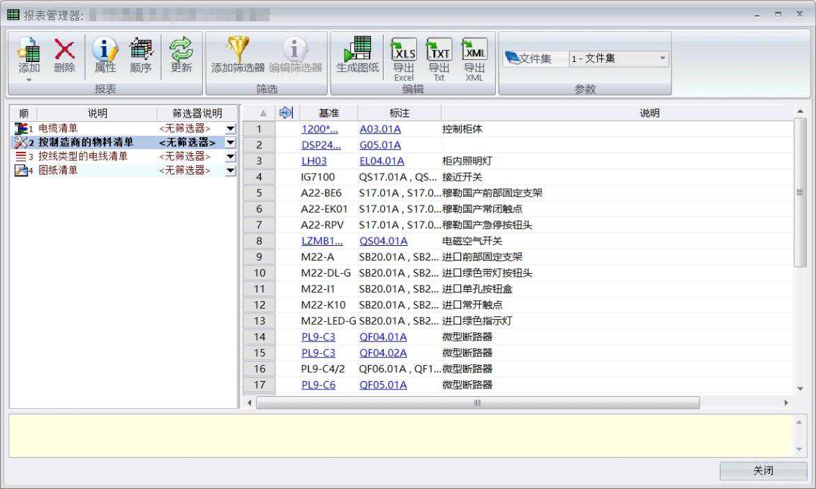 3.生成BOM清单,完成参数化的原理设计后,电气元件及线缆连接信息完全保存在数据库中,通过elecworks内置BOM导出工具,可自定义提取所有报表数据,例如电缆清单,接线表,物料清单,端子报表等。