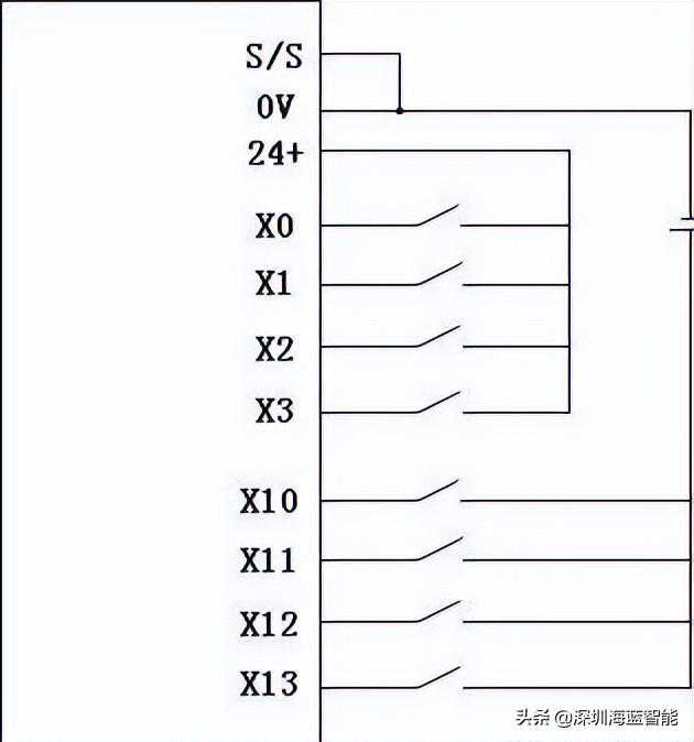 【58】在FX3UPLC的输入端口接入无源开关,XO—X3使用内置24V电源,而在X10—X13使用外置电源?应如何接线?
