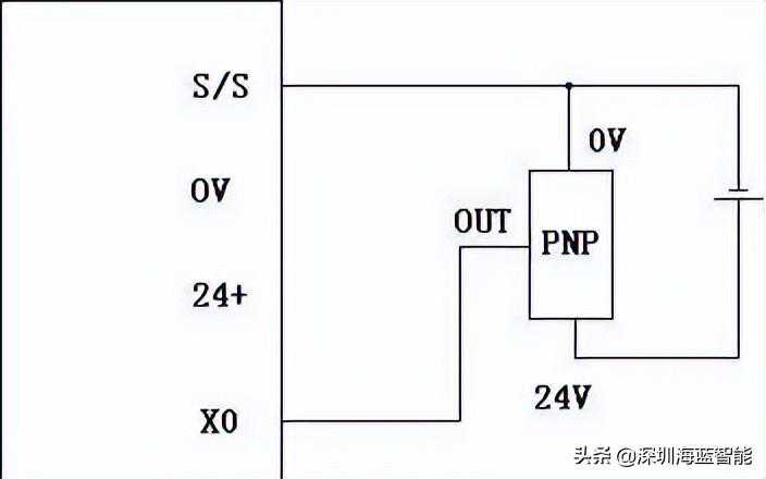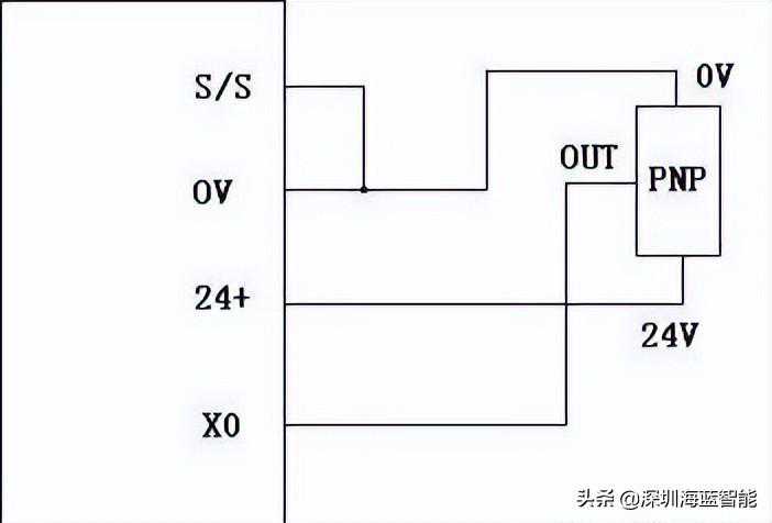 答:把PNP型三线制接近开关的信号输出端接PLC的输入口如X0,PNP型接近开关的0V端接到PLC上的0V端子,还要把S/S端子跟0V端子短接起来,PNP型接近开关的+24V端接到PLC上的24+端子。如果是外接24V电源的话,那么把PNP型三线制接近开关的信号输出端接PLC的输入口如X0,PNP型接近开关的0V端接到外接24V电源的负,还要把S/S端子跟外接24V电源的负短接起来,PNP型接近开关的+24V端接到外接24V电源的正。