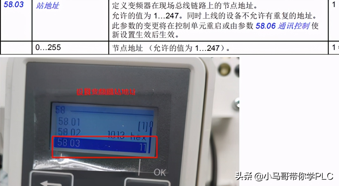 3、设置变频器通讯地址58.03=11;