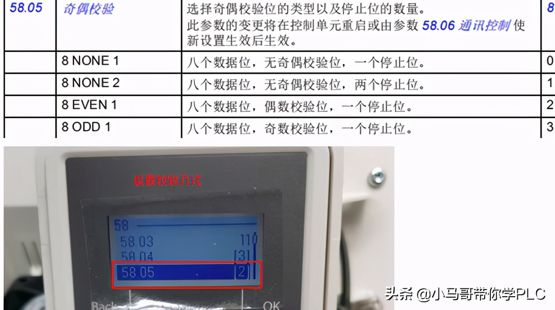 5、变频器设置通讯校验方式58.05=2(偶校验,1停止位)
