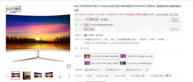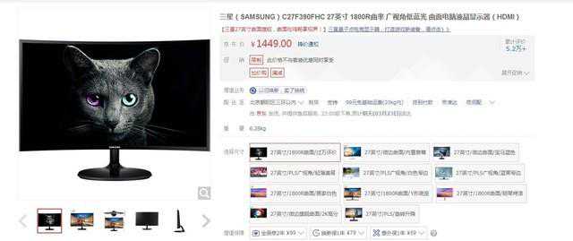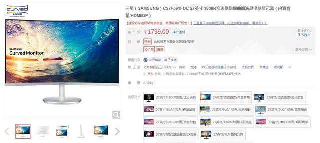 京东热销曲面显示器TOP9依然是三星,C27F591FD这款显示器曾今是2016年的爆款,也就是曲面快速发展的那一年,这款显示器的搭载的是一款27英寸、1080P全高清的1800R曲面屏,整体参数放在现在依然不过时。