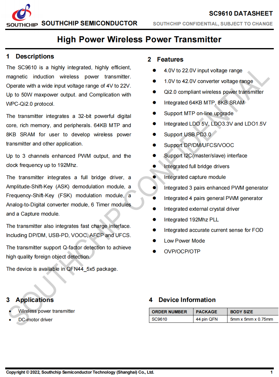 南芯SC9610南芯SC9610是一款高集成、高效的无线充电发射控制器芯片,最大输出功率可达50W,符合协议,该芯片集成了32位的数字核心以及丰富的元器件,可利用它轻松地开发出功率高达50W的无线充电发射器及其他应用。