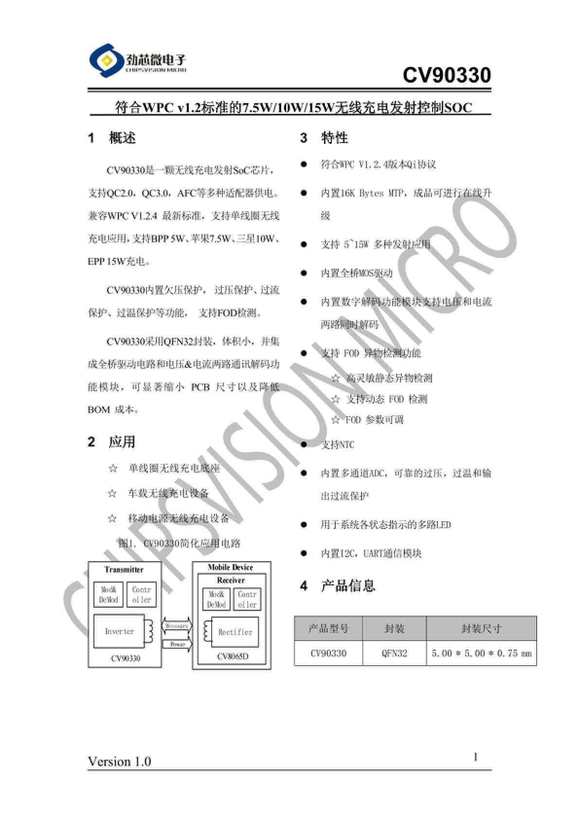 劲芯微CV90330CV90330是一颗无线充电发射SoC芯片,支持,,AFC等多种适配器供电。兼容最新标准,支持单线圈无线充电应用,支持BPP5W、苹果7.5W、三星10W、EPP15W充电。