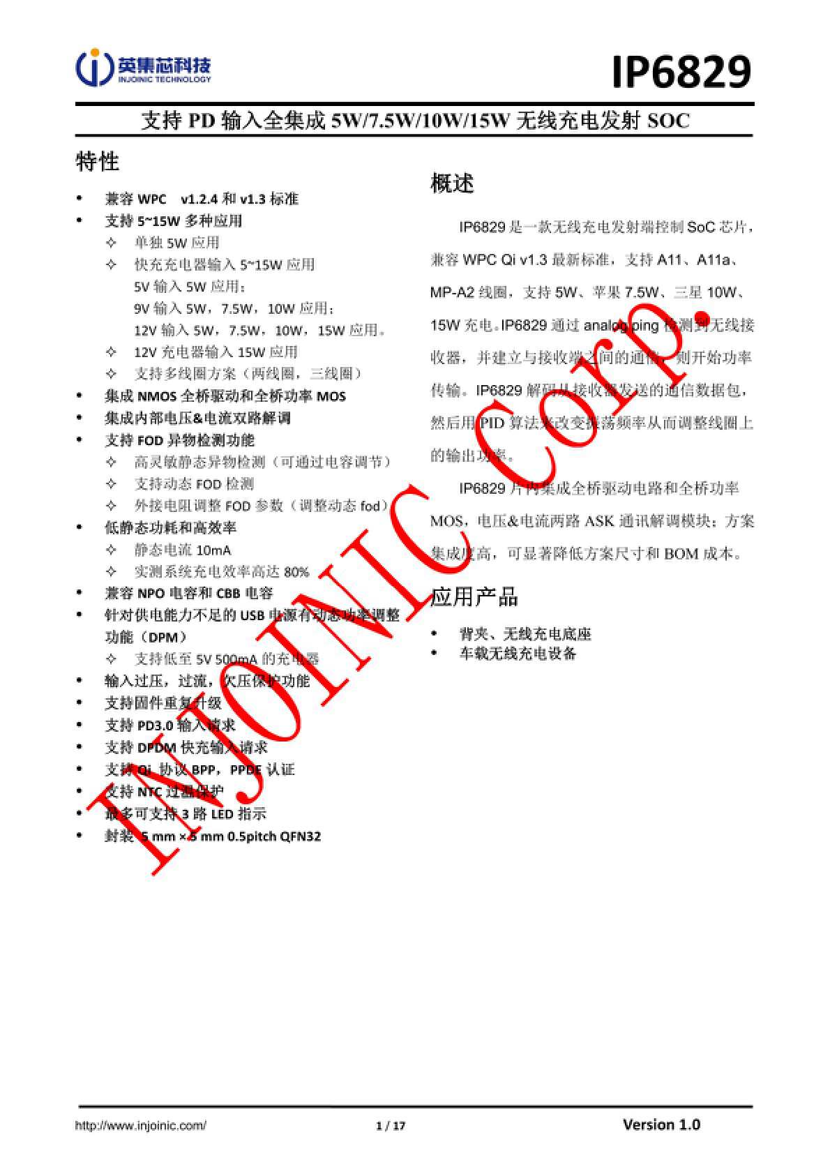 英集芯IP6829IP6829是一款无线充电发射端控制SoC芯片,兼容最新标准,支持A11、A11a、MP-A2线圈,支持5W、苹果7.5W、三星10W、15W充电。IP6829通过analogping检测到无线接收器,并建立与接收端之间的通信,则开始功率传输。