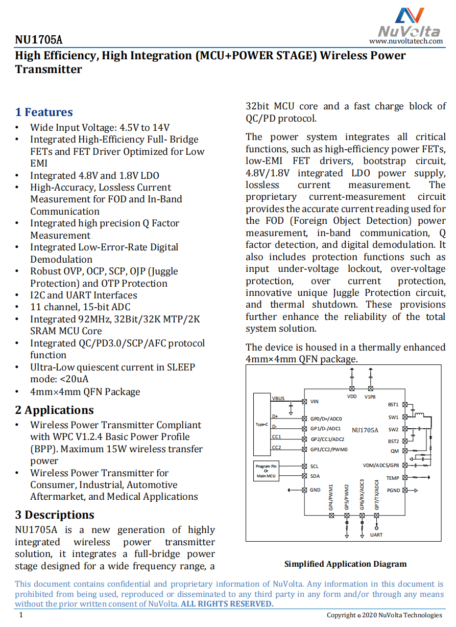 伏达NU1705ANU1705A是一款新一代高度集成的无线电力发射器解决方案,集成了为宽频率范围设计的全桥功率级、32位MCU核心和QC/PD协议的快速充电模块。