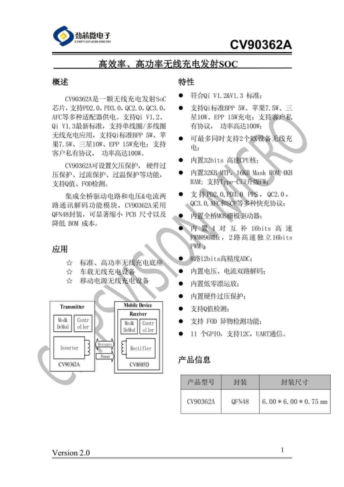 劲芯微CV90362ACV90362A是一颗无线充电发射SoC芯片,支持,,,,AFC等多种适配器供电。支持、最新标准,支持单线圈/多线圈无线充电应用,支持Qi标准BPP5W、苹果7.5W、三星10W、EPP15W充电;支持客户私有协议,功率高达100W。