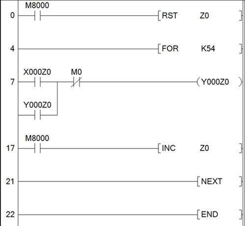 每次进行扫描都会先把Z0清0,然后进入循环(54次),第一遍Z0=0,这时X000Z0的地址是X000,Y000Z0的地址是Y000,X000触发Y000线圈并形成自锁,通过INC指令Z0自加1;第二遍,Z0等于1,这时X000Z0的地址是X001,Y000Z0的地址是Y001,X001触发Y001线圈并形成自锁,通过INC指令Z0自加1;……