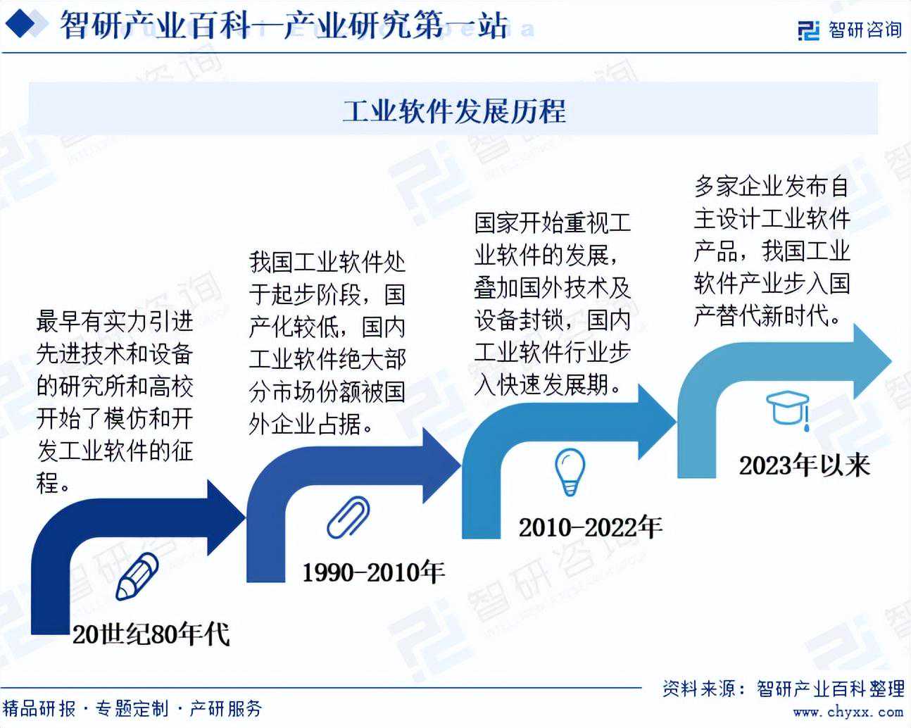 20世纪80年代初,伴随着昂贵的IBM大型机、VAX小型机、阿波罗工作站的引入,图形和设计CAD软件也进入中国科研工作者的视野。最早有实力引进先进技术和设备的研究所和高校开始了模仿和开发工业软件的征程。该时期所开发的工业软件以二维CAD绘图软件为主。20世纪90年代,科技部对研发设计软件的重点支持转向三维CAD软件。90年代后期,国内工业软件受到国外软件巨头入侵,工业软件市场竞争激烈,本土企业产品同质化严重,缺乏竞争力,国内工业软件绝大部分市场份额被国外企业占据。直至21世纪10年代,中国的工业软件发展整体呈现速度缓慢、自主创新能力较低的特点,处于起步阶段。2015年以后,国家开始重视工业软件的发展,工业软件相关政策密集出台,国家资金投入持续增加,行业内龙头企业紧抓市场机遇快速发展。叠加国外技术及设备封锁,国内企业加快自主研发进度,国产化程度提高,国内工业软件行业步入快速发展阶段。2023年以来,多家企业发布自主设计工业软件产品,我国工业软件产业步入国产替代新时代。