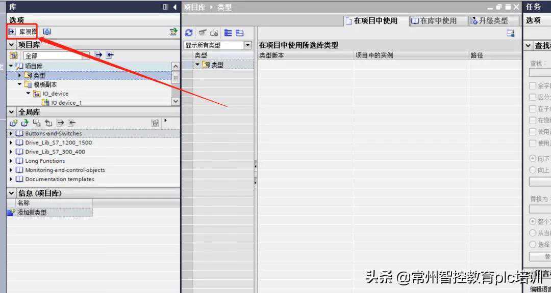 打开TIA博途软件,进入项目视图,在软件的右侧任务卡处单击库,如图1-1所示,从上至下分别是”库视图“和“库管理”按钮(库管理在库视图右边)、项目库窗格、全局库窗格、信息窗格。