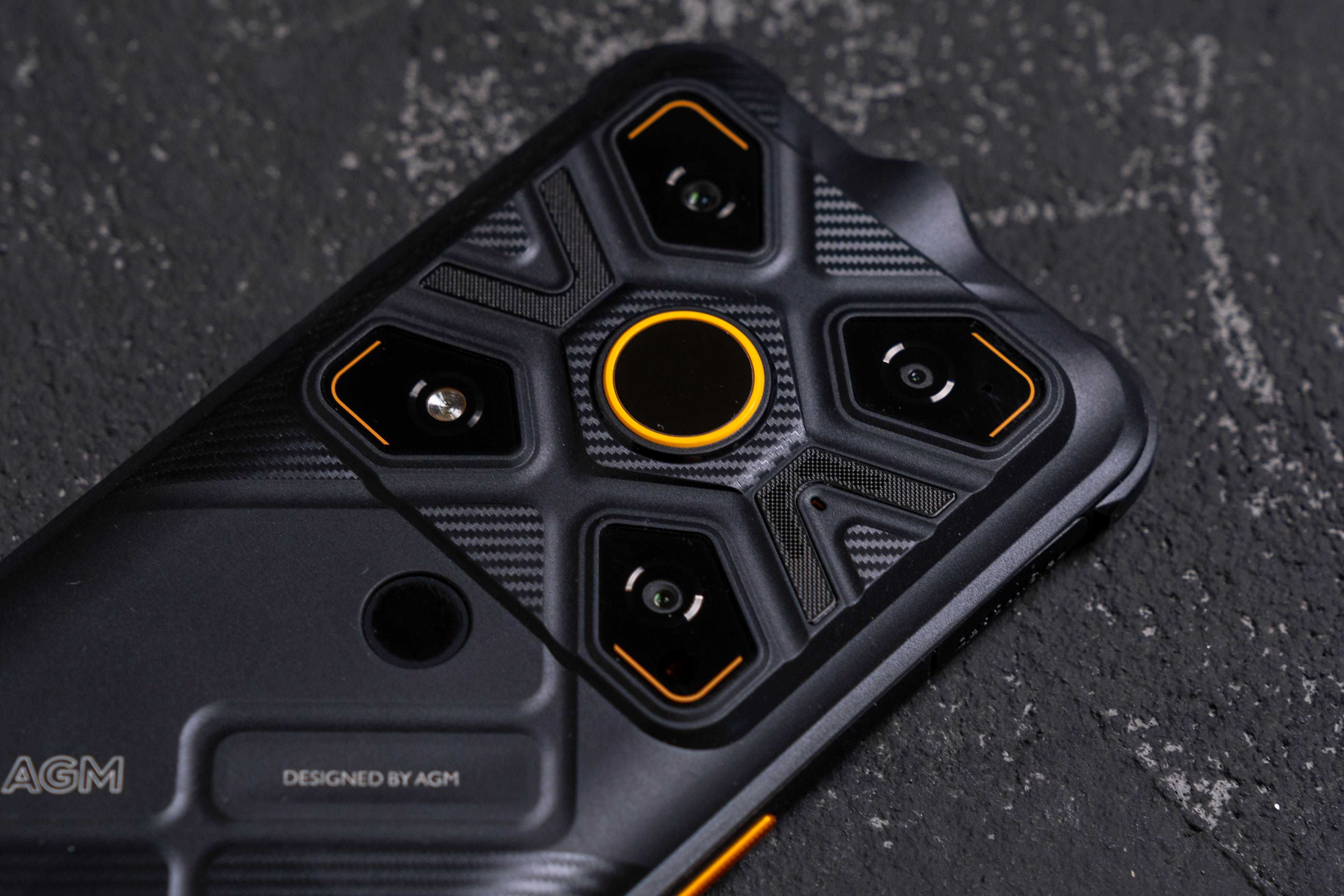 机身背部采用了凯夫拉文里设计,直男的心头之爱啊。拍照方面采用了5摄方案,包括48MP主摄+2MP微距+20MP红外夜视+热成像,摄像模组排列比较对称,也显得比较另类。