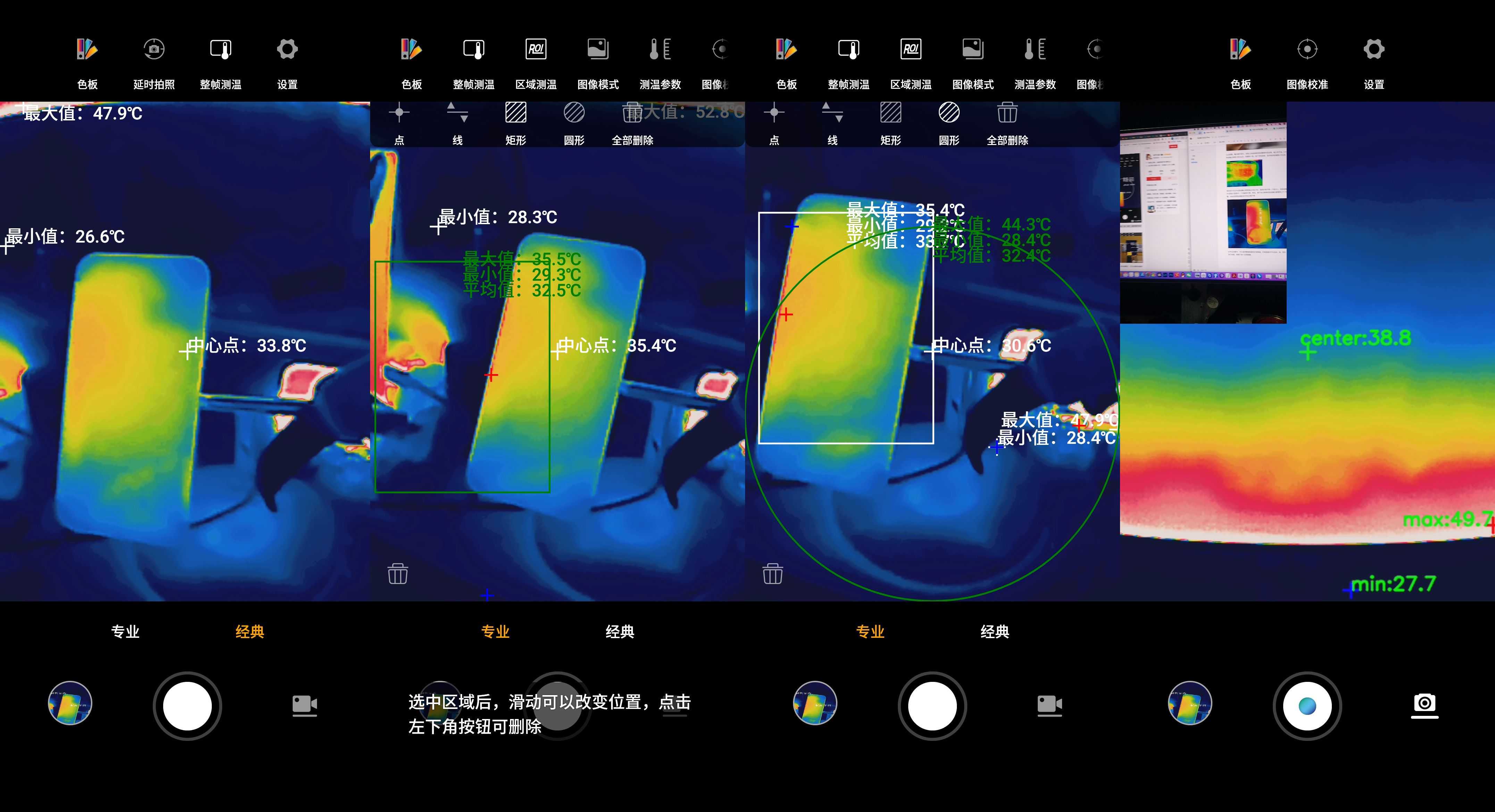 在专业设置中,可以选择整帧测温和区域测温,区域测温中可以选点、线、矩形、圆形等形状进行绘制,聚焦于某个区域测量。除了默认的热成像外,还有双屏、融合、画中画模式,在看热成像的同时,还能清楚的看到对应产品的位置。