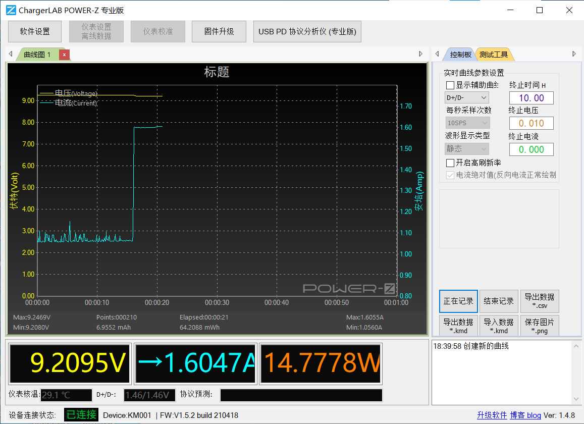 虽然AGMG1SPro配备的是一个最大输出功率18W的适配器插头,但我觉得其充电速度还是比较快的,毕竟搭载了一块5500mAh的电池。电池剩余电量3%的时候进行测试,此时充电电压能达到9.2V,充电电流能达到1.6A,充电功率为14.7W。