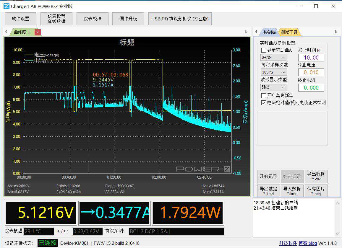 电池电量从3%充到100%共用时2小时50分钟,充电到40分钟,电池电量大约在40%时,电流会降低,并且在整个充电过程,电流一直在降低。充电电压在电池电量达到80%时开始降低,目的是涓流充电保护电池。