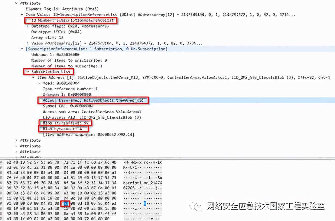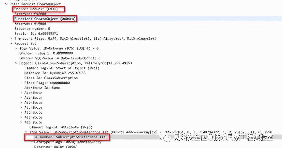 组态读取MD92地址处的变量值,读取变量的操作码Opcode为0X31,Function为CreateObject(0x04ca),寻找第7个Attribute属性中IDNumber字段SubscriptionReferenceList。
