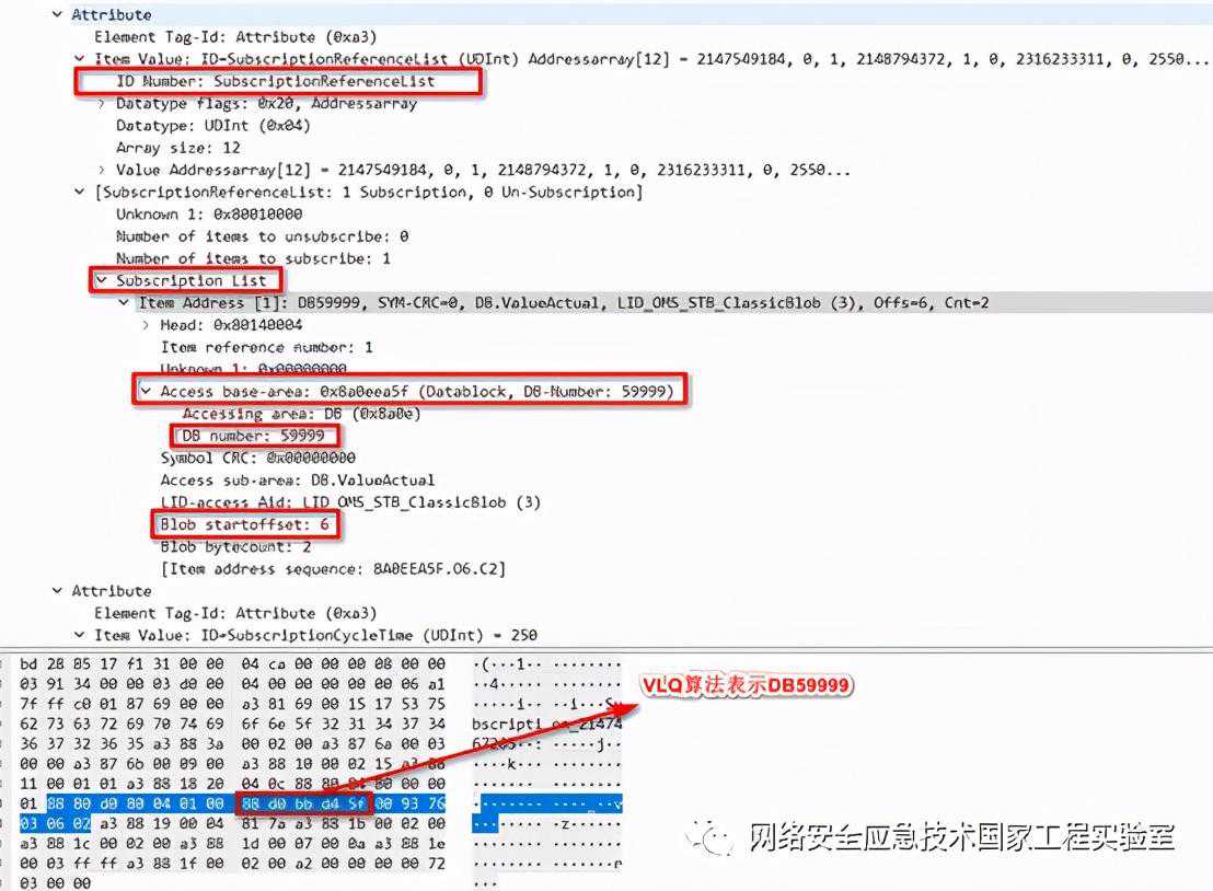 展开SubscriptionReferenceList的详细描述,在SubscriptionList下包含了具体的访问区域与详细地址信息,Accessbase-areaa区域经过算法解析后得到0x8a0eea5f,表示DB59999(原始数据帧中字节为0x88d0bbd45f),Blobstartoffset为6,表示DB5999中的访问地址,读取字节数Blobbytecount为2,表示读取两个字节长度。