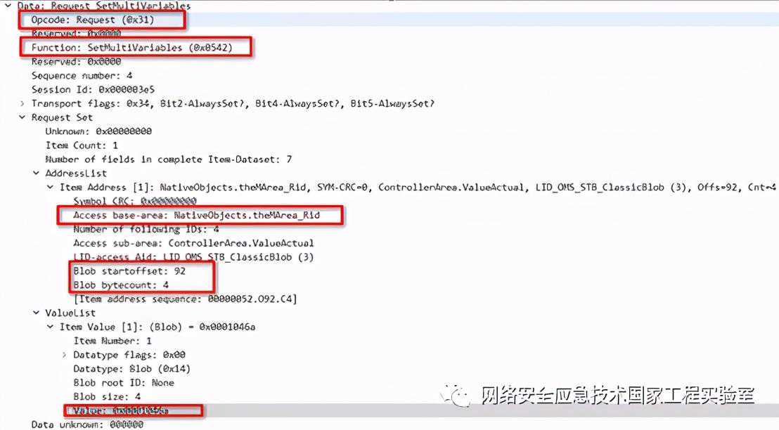 写入变量的操作码Opcode为0X31,Function为SetMultiVariables(0x0542),Accessbase-areaa字段显示为M区(0x52),写入地址Blobstartoffset为92,写入字节数Blobbytecount为4,写入的值为value:0x0001046a。