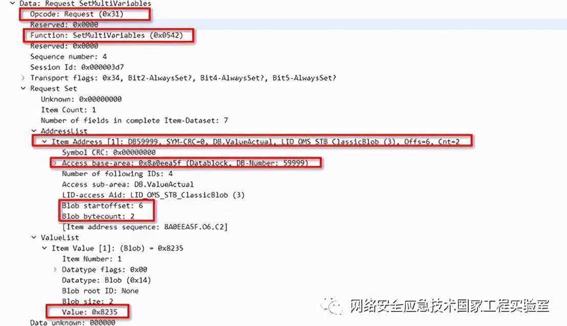 写入变量的操作码Opcode为0X31,Function为SetMultiVariables(0x0542),Accessbase-areaa字段显示为DB59999(0x8a0eea5f),写入地址Blobstartoffset为6,写入字节数Blobbytecount为2,写入的值为value:0x8235。