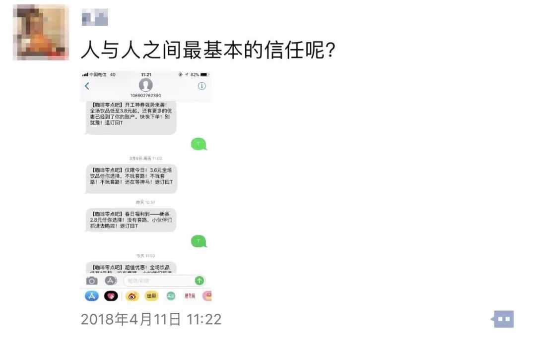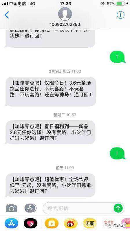 4月14日,记者联系到了“咖啡零点吧”,工作人员告诉记者,短信推送的活动各种各样,客户“T”退订的,只是当时的活动,而针对下一条活动,是无法取消的。