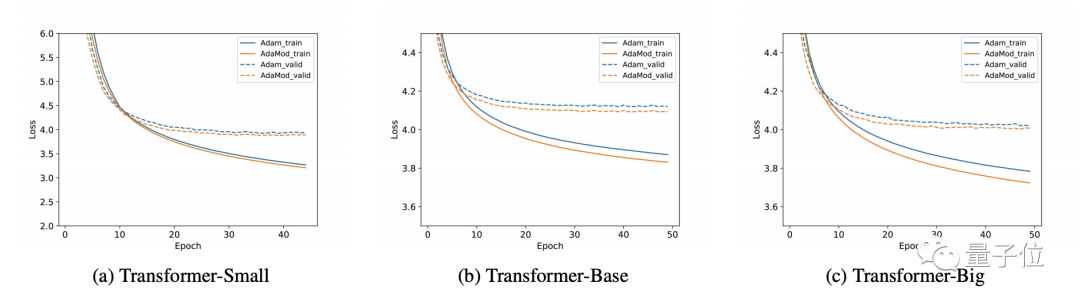 在3个基于Transformer的神经机器翻译模型上,没有预热的AdaMod显示出了比预热的Adam有着更快的收敛速率和更好的收敛结果。
